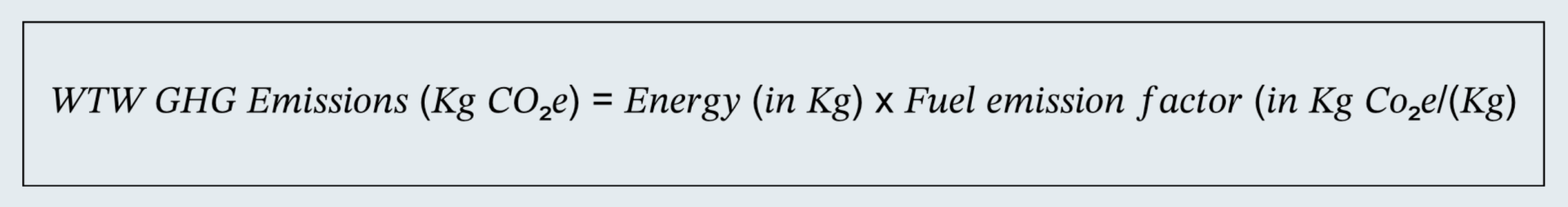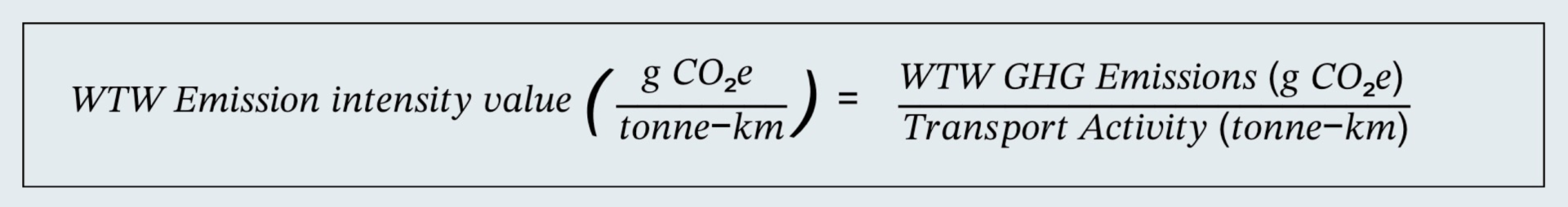 The numerator (WTW GHG emissions) is based on actual energy or fuel consumption multiplied by the appropriate emission factor.